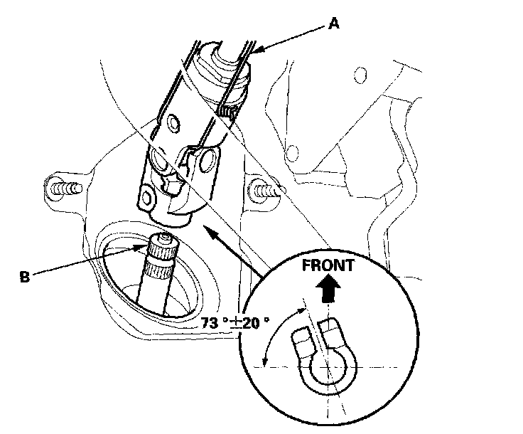 26. With the rack in the straight ahead driving position, cut the wire (A) and slip the lower end of the steering joint onto the pinion shaft (B) in the range shown.