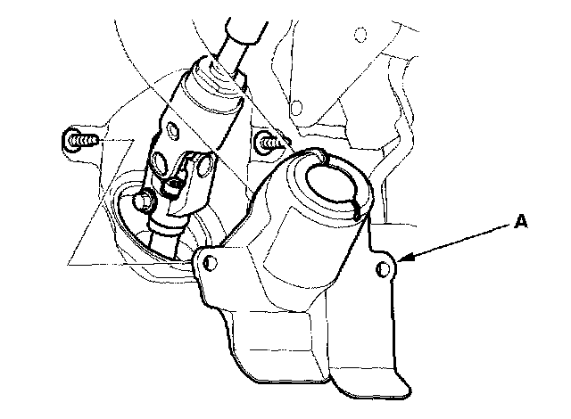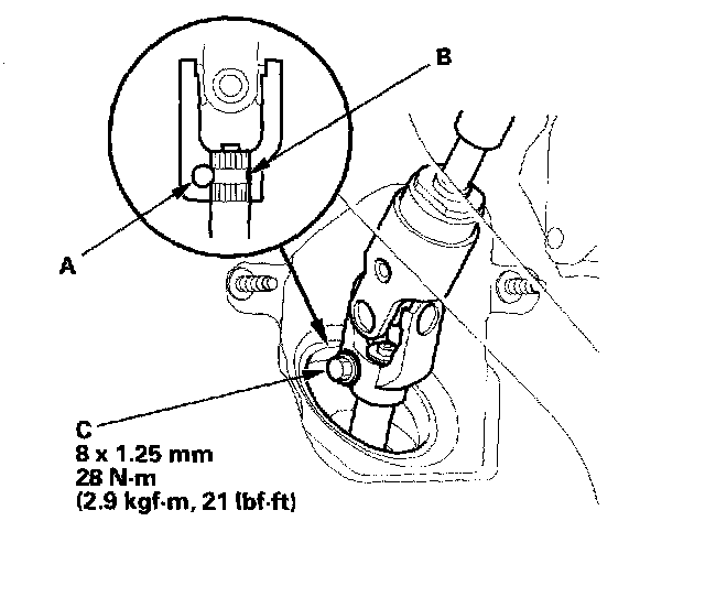 27. Align the bolt hole (A) on the steering joint with the groove (B) around the pinion shaft, and loosely install the joint bolt (C). Be sure that the joint bolt is securely in the groove in the pinion shaft. Pull on the steering joint to make sure that the steering joint is fully seated. Tighten the steering joint bolt to the specified torque.