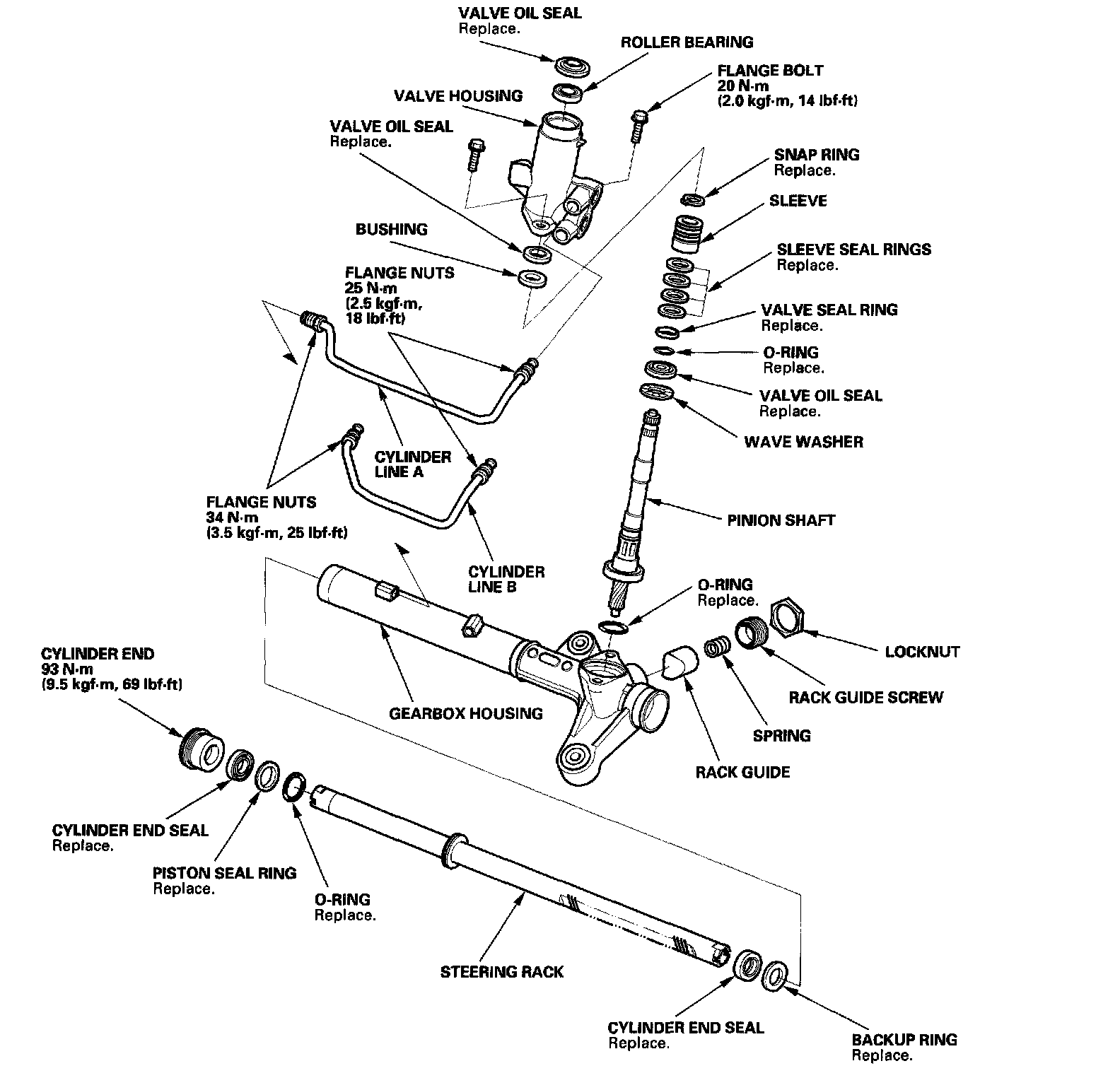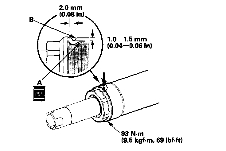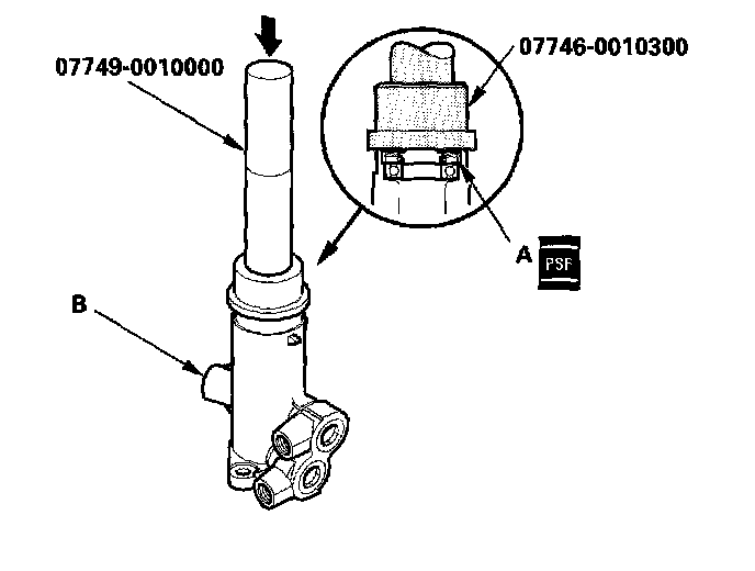 70. Coat the inside surface of the cylinder end (A) with power steering fluid, then install the cylinder end by screwing it into the cylinder (B). Tighten the cylinder end to the specified torque.