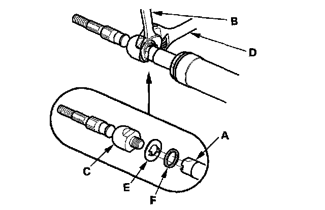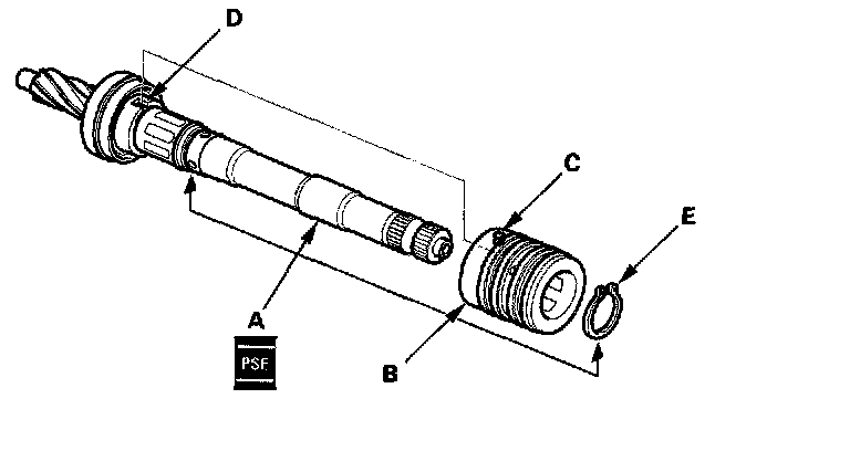 43. Apply power steering fluid to the surface of the pinion shaft (A). Slide the sleeve (B) onto the pinion shaft by aligning the locating pin (C) on the inside of the sleeve with the cutout (D) in the shaft. Then install the new snap ring (E) securely in the pinion shaft groove. Be careful not to damage the valve seal ring when inserting the sleeve.