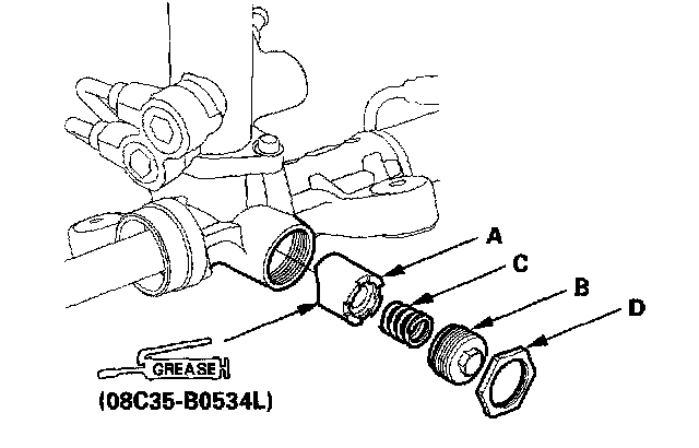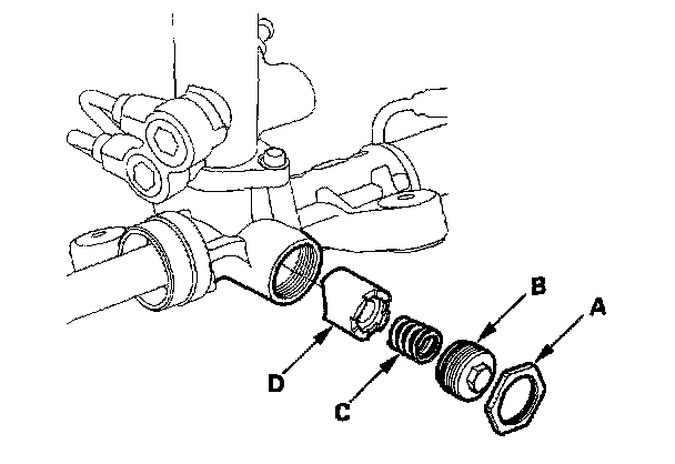 78. Remove the old sealant from the rack guide screw (B), then apply new sealant (Three Bond 1215 or Loctite 5699) to the middle of the threads. Install the spring (C), rack guide screw and locknut (D).