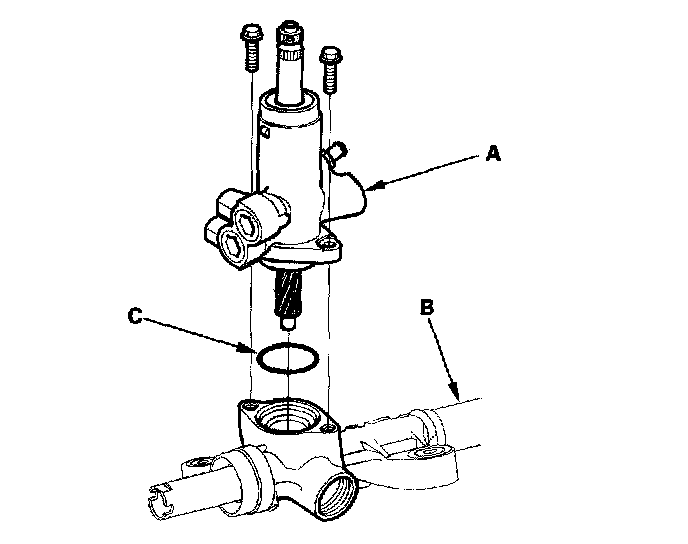 10. Remove the two flange bolts, then remove the valve body unit (A) from the gearbox (B). Remove the O-ring (C), and discard it.