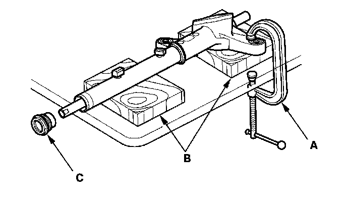 12. Hold the gearbox housing using a C-clamp (commercially available) (A) and the wooden blocks (B) as shown. Do not clamp the cylinder part of the gearbox housing in the vise. Then remove the cylinder end (C).