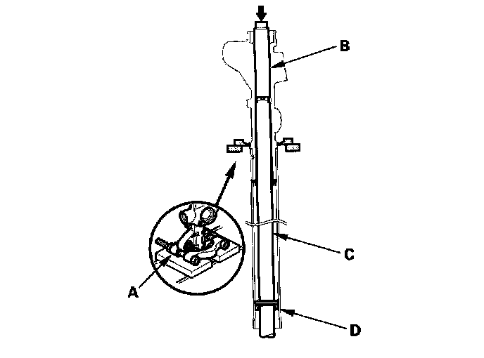 4. Hold the flat surface sections (A) of the steering rack with a wrench (B), and unscrew both rack ends (C) with a wrench (D). Be careful not to damage the rack surface with the wrench.