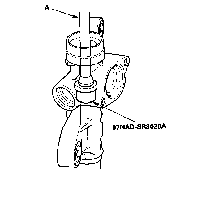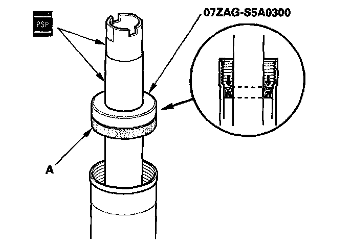 54. Coat the piston seal ring (A) and the inside of the special tool with power steering fluid, then carefully slide the tool onto the rack and over the piston seal ring.