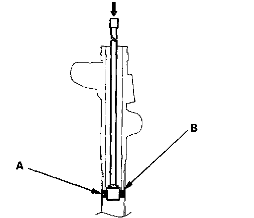 17. Place the steering gearbox in a press, then remove the cylinder end seal (A) and backup ring (B) from the gearbox by pressing on the 24 "long, 3/8" drive extension.
