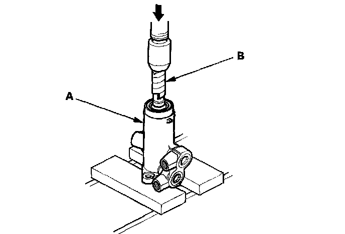 63. Install the cylinder end seal (B) into the bottom of the cylinder by pressing on the tool with a press. Do not push on the tool with excessive force as it may damage the cylinder end seal.