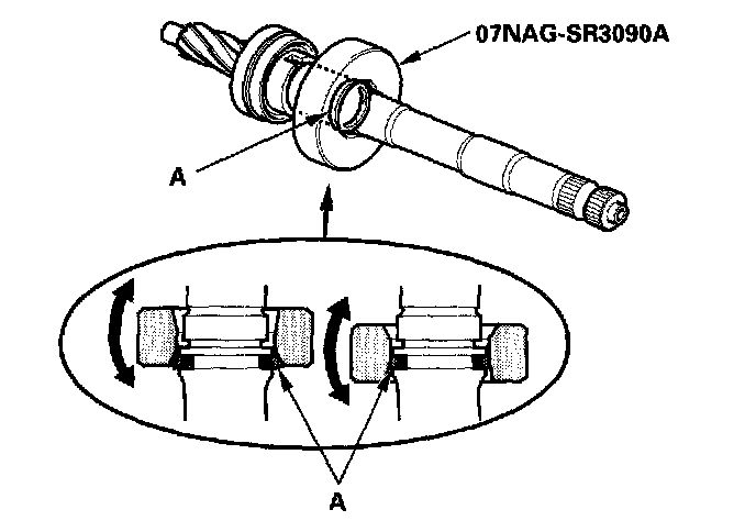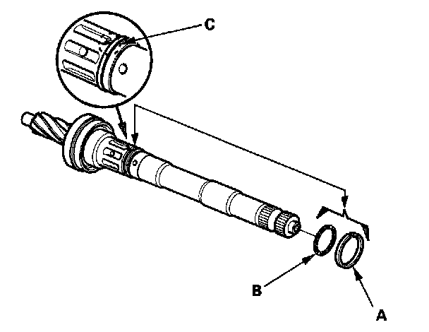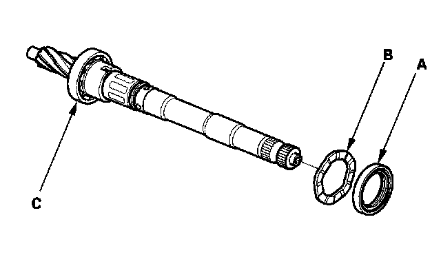 ^ Inspect the ball bearing (C) by rotating the outer race slowly. If there is any excessive play or wear, replace the pinion shaft and sleeve as an assembly.