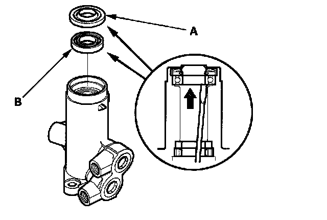 46. Apply power steering fluid to the seal ring lip of the new valve oil seal (A), then install the seal in the valve housing (B) using a hydraulic press and special tools. Install the seal with its grooved side facing the tool.