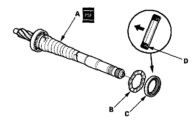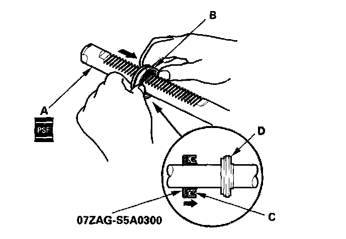 58. Install the cylinder end seal (B) onto the steering rack with its grooved side (C) toward the piston (D).