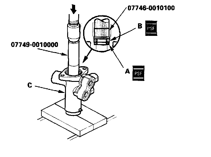 44. Apply power steering fluid to the seal ring lip of the new valve oil seal (A), then install the seal and bushing (B) in the valve housing (C) using a hydraulic press and special tools. Install the seal with its grooved side facing the tool.