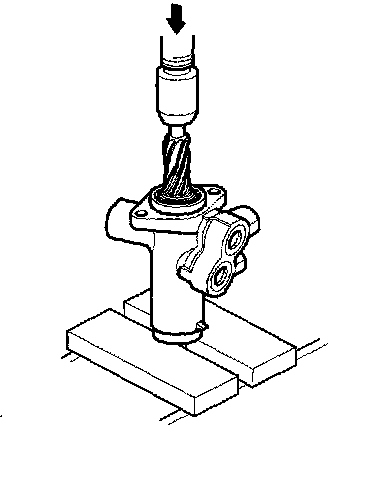 50. Press the pinion shaft/sleeve into the valve housing with a hydraulic press. Check that the pinion shaft/sleeve turns smoothly by hand after installing it.