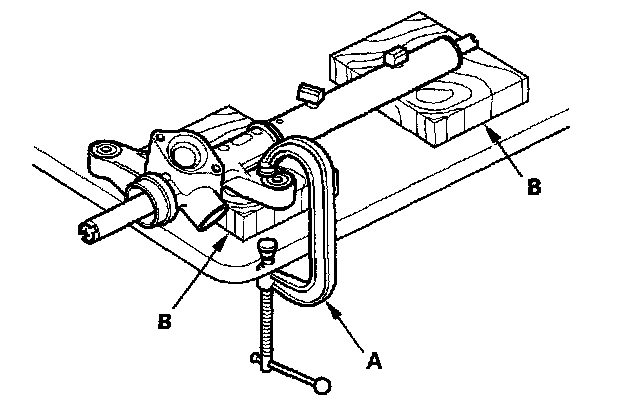 69. Hold the gearbox housing using a C-clamp (commercially available) (A) and wooden blocks (B). Do not clamp the cylinder part of the gearbox housing in the vise.