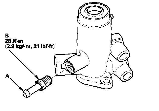 72. Install the return line joint (A), and tighten the 16 mm flare nut (B).