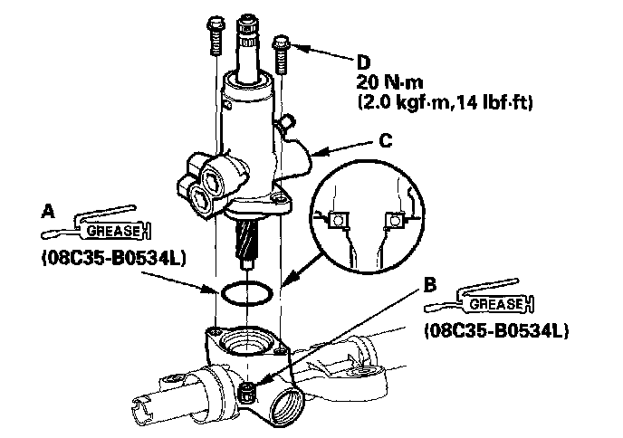 33. Coat the inside surface of the new valve oil seal (C) with power steering fluid, and install the seal with its grooved side facing opposite the bearing, then slide it over the pinion shaft, being careful not to damage its sealing lip (D).