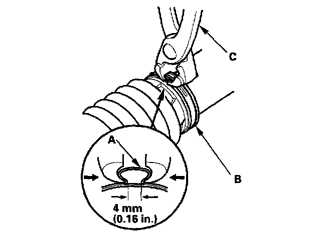 89. Close the ear portion (A) of the band (B) with commercially available pincers, Oetiker 1098 or equivalent (C).
