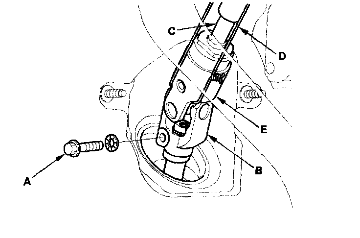 9. Remove the steering joint bolt (A), and disconnect the steering joint by moving the steering joint (B) toward the column. Hold the lower slide shaft (C) on the column with a piece of wire (D) between the joint yoke (E) on the lower slide shaft to the joint yoke on the upper shaft.