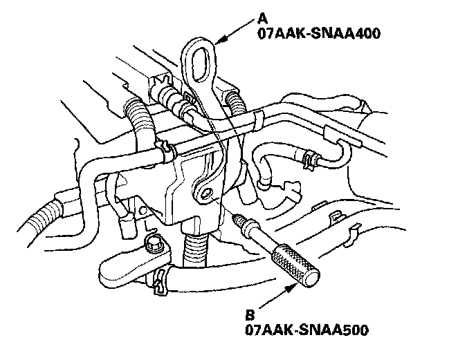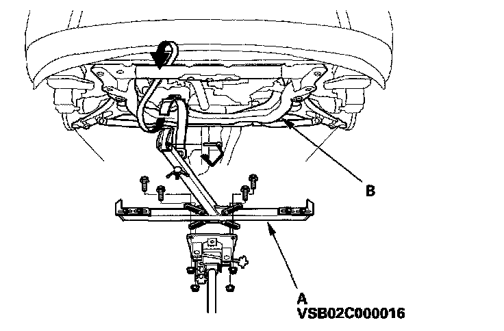 26. Attach the front subframe adaptor (A) to the front subframe (B) and the transmission jack (model number LSL W9371) or the powertrain lift (model number OTC-1585), then tighten the special tool screw.