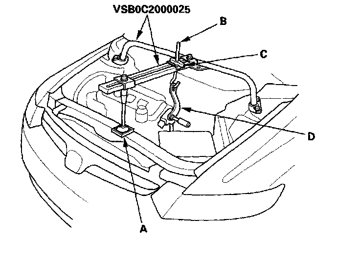 15. Install the front leg assembly (A), hook (B), and wing nut (C) from an A and Reds engine support hanger (AAR-T-12566) onto the engine hanger. Carefully position the engine hanger on the vehicle, and attach the hook to the slotted hole in the support eyelet (D). Tighten the wing nut by hand to lift and support the engine/transmission assembly.