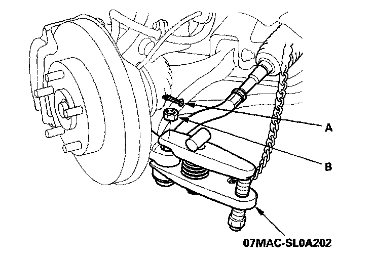 23. Remove the lower ball joint mounting bolt (A) and flange nuts (B) from the lower arm.