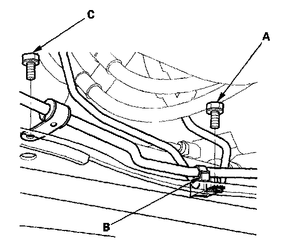 19. Remove the inlet line clamp bolt (A). Open the return line holder (B), and remove the return line clamp bolt (C).