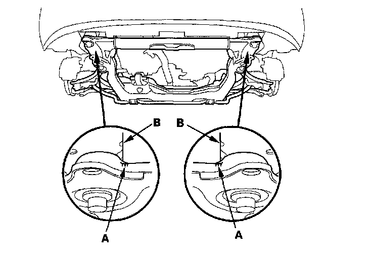 25. Note the reference marks (A) on both sides of the subframe that line up with the body (B).