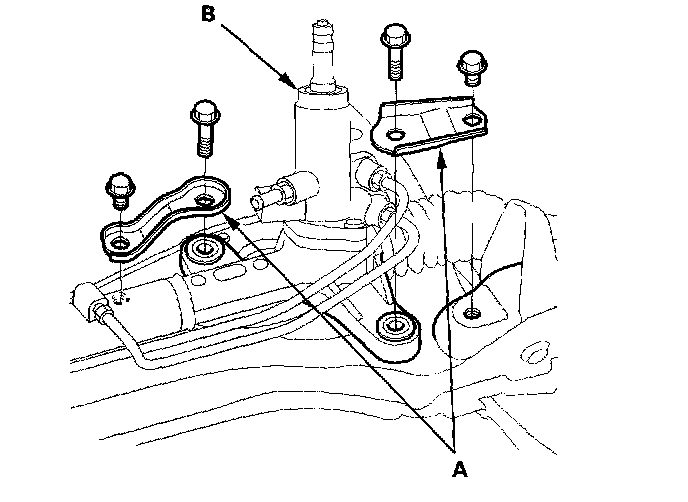 35. Remove the two 10 mm bolts from the right side of the steering gearbox, then remove the mounting bracket (A) and mounting cushion (B).