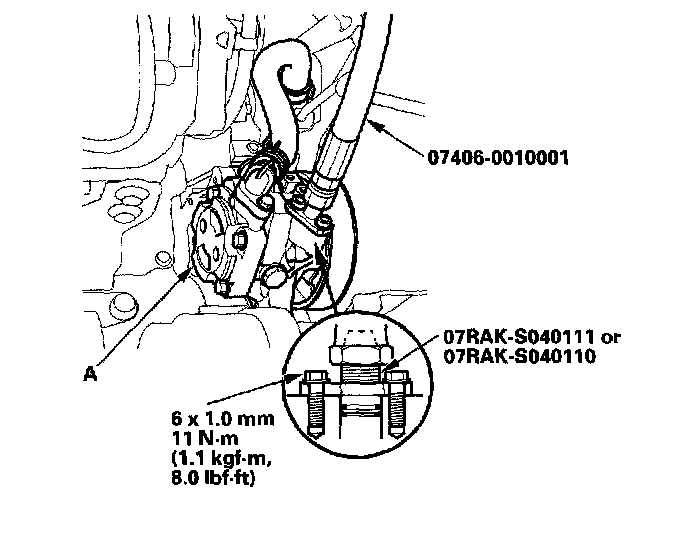 4. Disconnect the pump outlet hose, then install the P/S joint adapter (pump) on the pump (A). Take care so as not to spill the power steering fluid on the frame and other parts.
