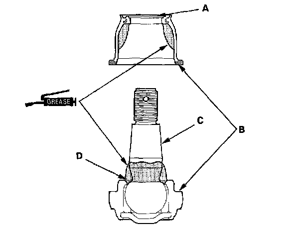 4. Wipe the grease off the tapered portion of the pin (C), and pack fresh grease into the base (D). Do not let dirt or other foreign materials get into the boot.