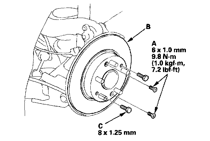 NOTE: If the brake disc has clung to the hub bearing unit. Screw two 8 x 1.25 mm bolts (C) into the brake disc to push it away from the hub bearing unit. Turn each bolt 90 degrees at a time to prevent cocking the brake disc.
