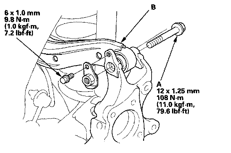 5. Remove the flange bolt (A), and disconnect the upper arm (B) from the knuckle.