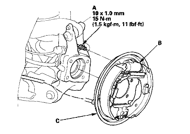 2. Disconnect the brake line (A) from the wheel cylinder (B). Remove the rear brake assembly (C) from the knuckle.