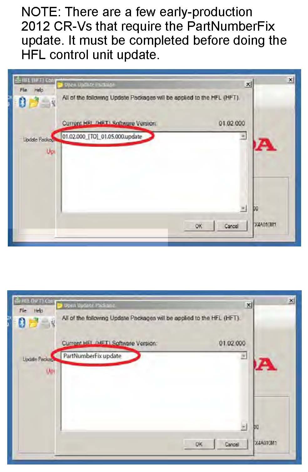 There are a few early-production 2012 CR-Vs that require the PartNumberFix update. It must be completed before doing the HFL control unit update.
