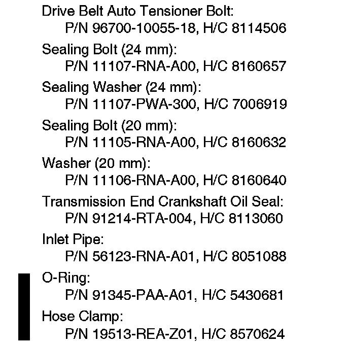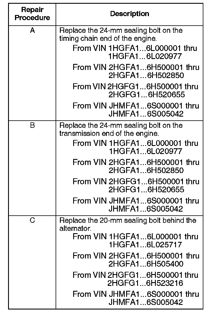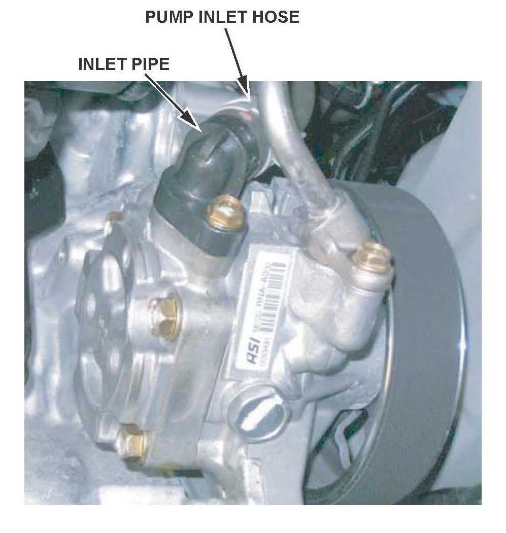 Replace the affected engine block sealing bolt(s) and washer(s), and/or replace the power steering pump inlet pipe, 0-ring, and hose clamp.