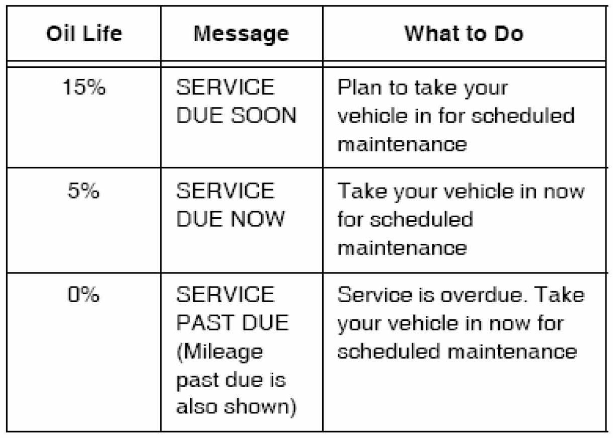 For owners who only drive their vehicles occasionally, and the oil life never reaches 15% at the end a 12-month period since the engine oil was last replaced, the engine oil should be replaced and the oil life indicator reset to 1000/0. When resetting the oil life indicator, the system will flash the maintenance item code that would have come up when the oil life reached 15%. Make sure all maintenance is done according to that maintenance item code.