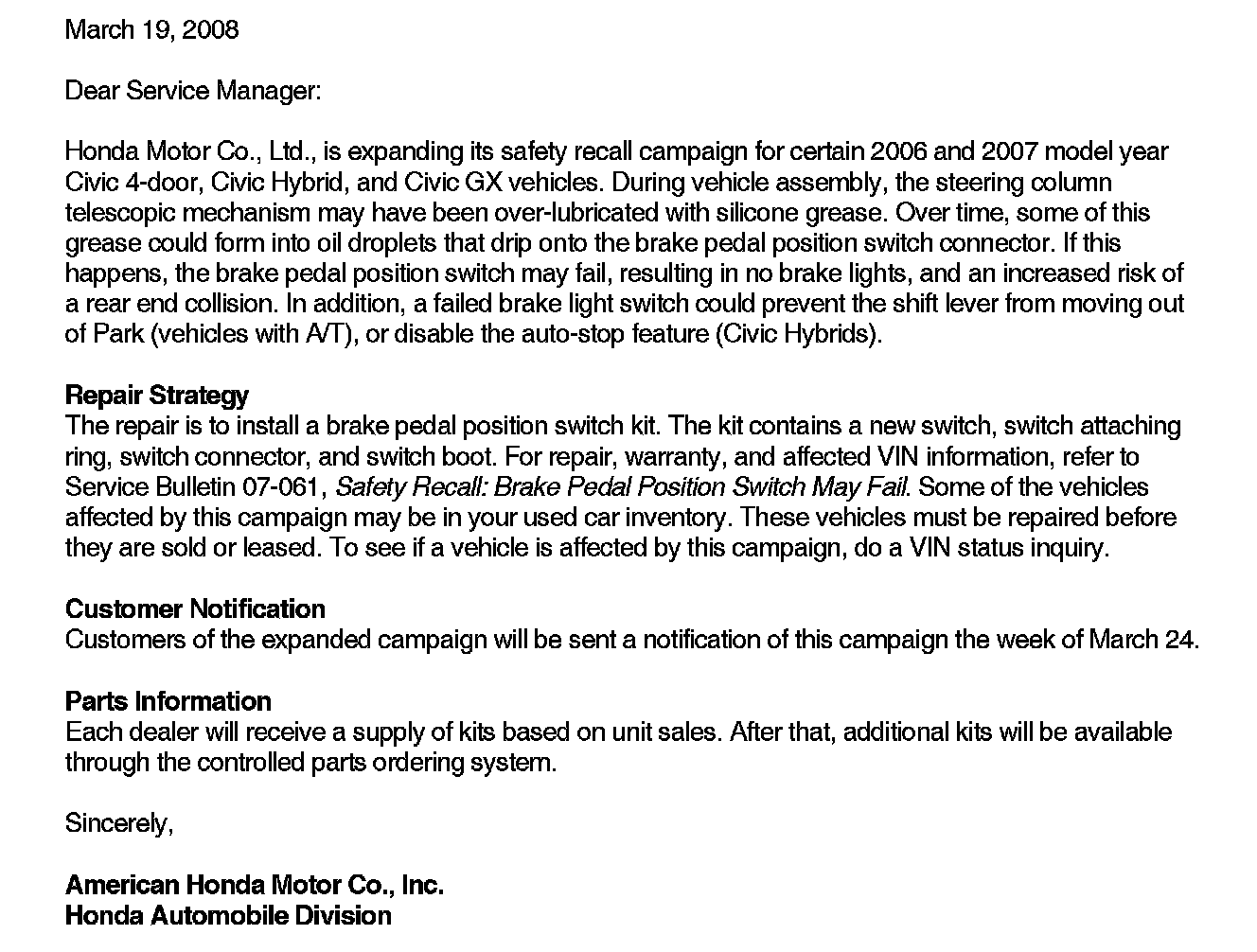 Recall - Potential Brake Pedal Position Switch Failure