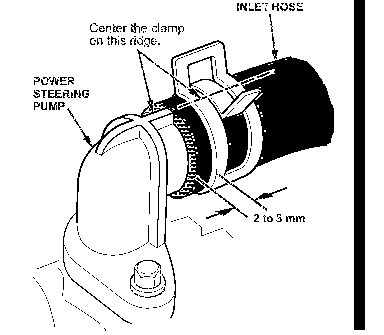 The pump inlet hose is shown attached to the power steering pump to show the proper position of the clamp. Position the clamp directly in front of the ridge on the inlet pipe before installation. It is easier to set the clamp before installation.*