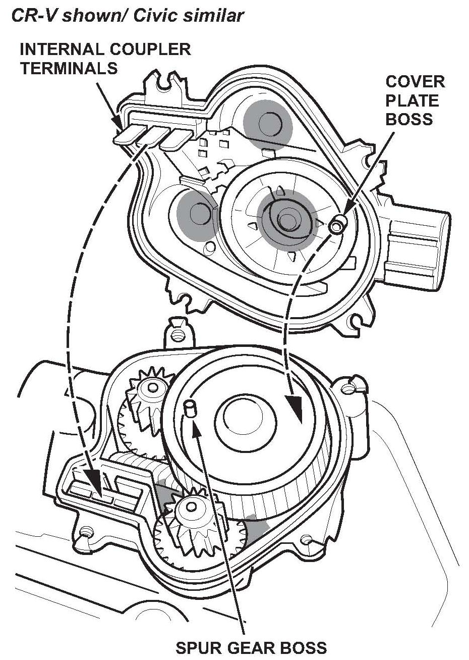 9. Install the cover plate onto the motor with the internal coupler terminals aligned. Make sure the new cover plate boss is about 180 degrees out of phase from the spur gear boss.