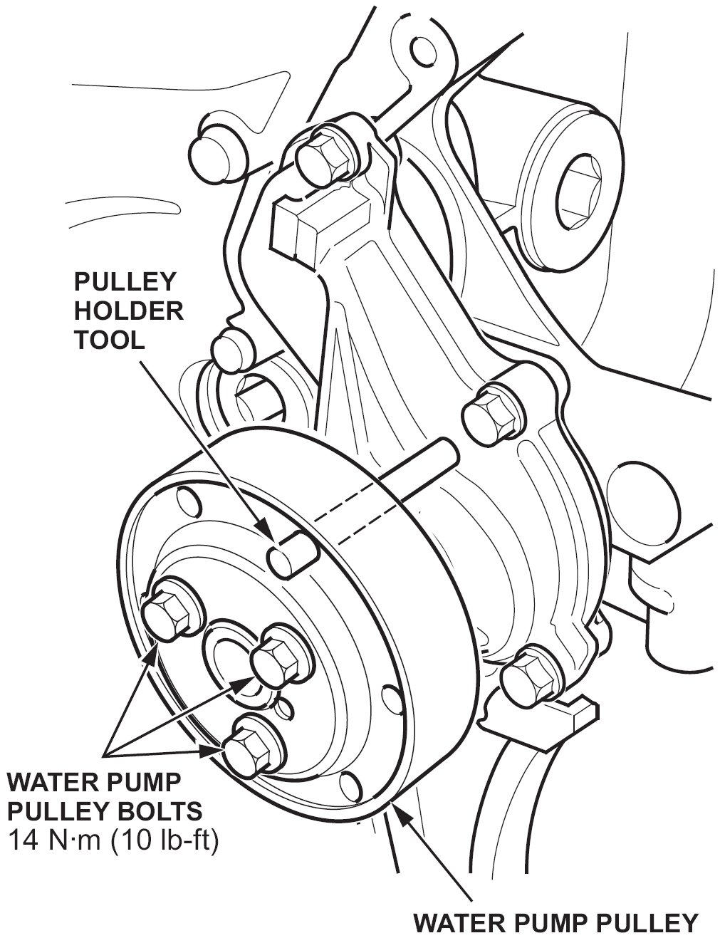 4. Install a new water pump pulley with three new bolts. Insert the pulley holder in the 12'o clock position to keep the pulley from moving while you torque the bolts to 14 N.m (10 lb-ft).