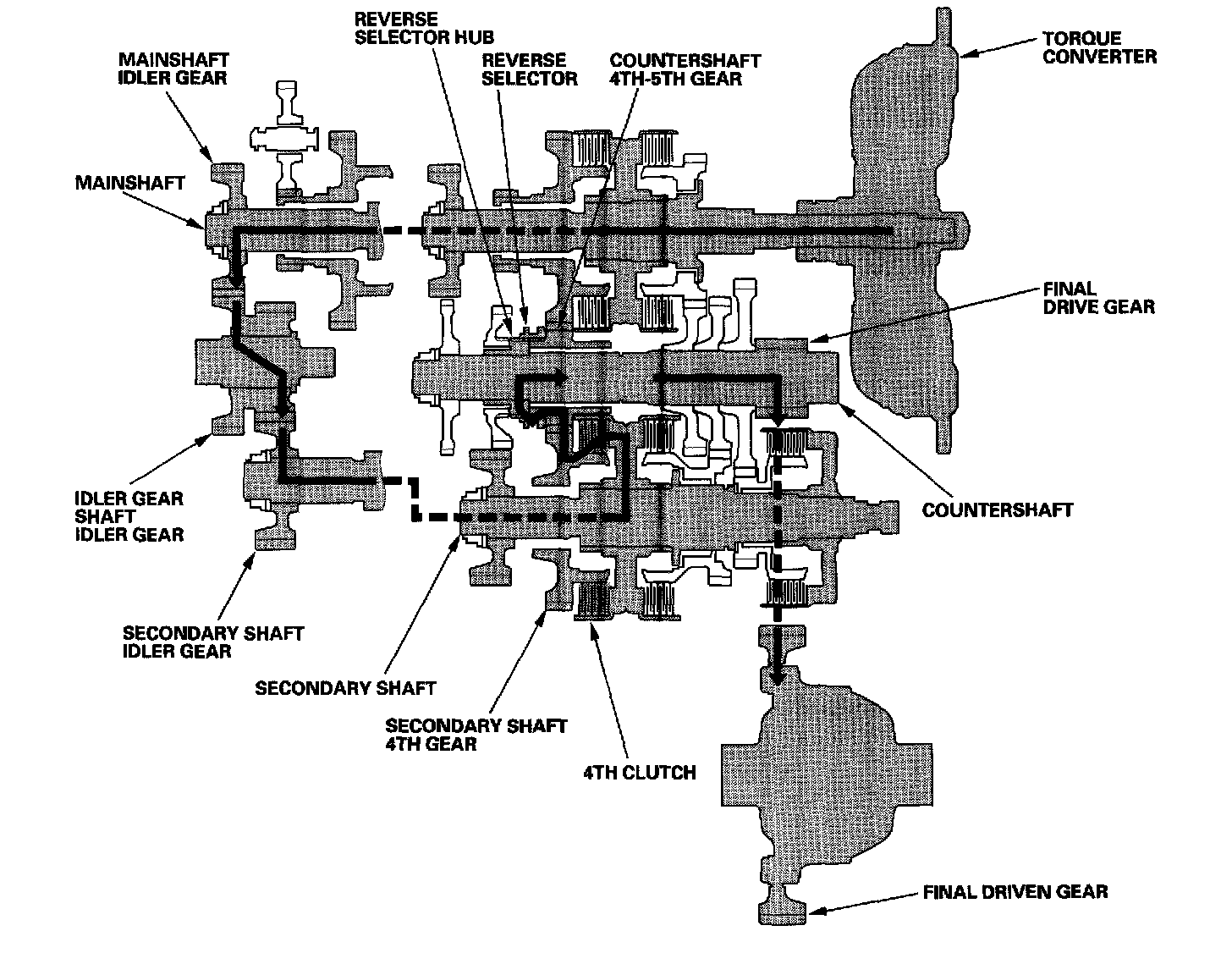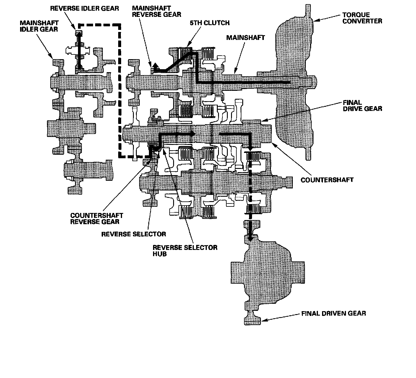 Engine power transmitted from the torque converter drives the mainshaft idler gear, the idler gear shaft idler gear, and the secondary shaft idler gear, but hydraulic pressure is not applied to the clutches. Power is not transmitted to the countershaft. In this position, the position of the reverse selector differs according to whether the shift lever shifted from D or R position: