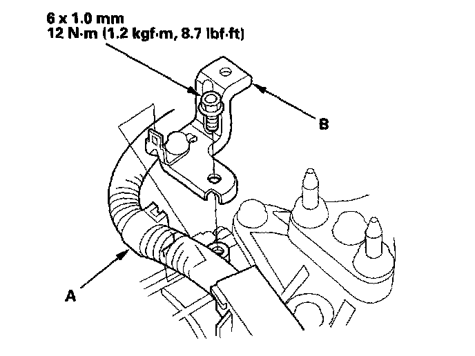 2. Remove the harness clamp (A) from its bracket, and remove the air cleaner housing bracket (B).