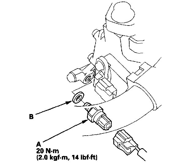 5. Install the new 2nd clutch transmission fluid pressure switch with a new sealing washer (B), and tighten the metal part of the switch.