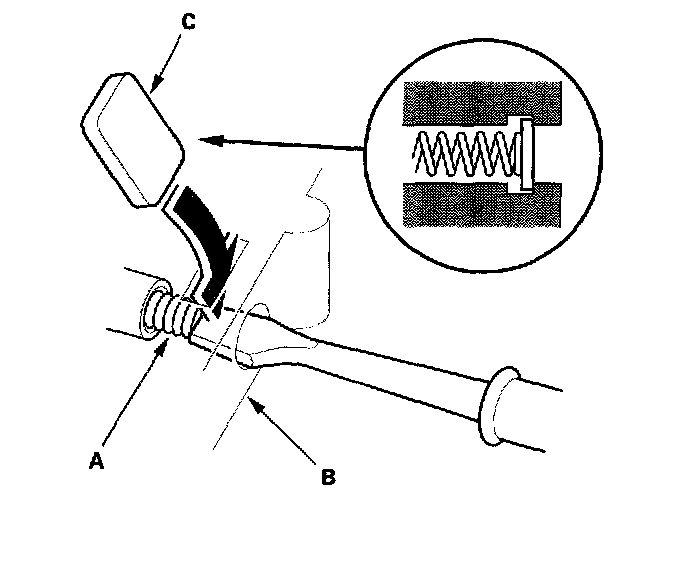 3. Install the valve and valve spring (A) in the valve body (B). Push the valve spring in with a screwdriver, then install the spring seat (C).