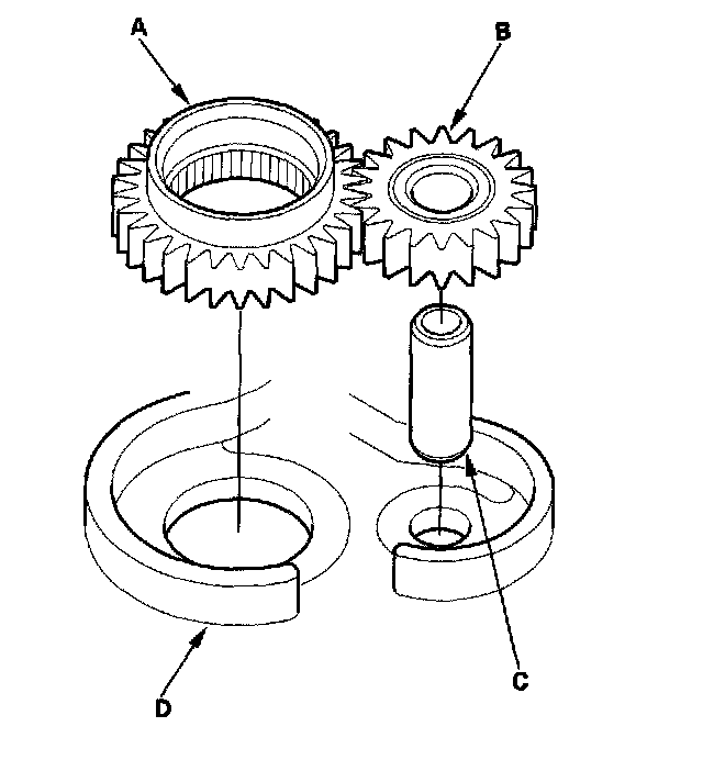 1. Install the ATF pump drive gear (A), driven gear (B), and ATF pump driven gear shaft (C) in the main valve body (D). Lubricate all parts with ATF, and install the ATF pump driven gear with its grooved and chamfered side facing up.