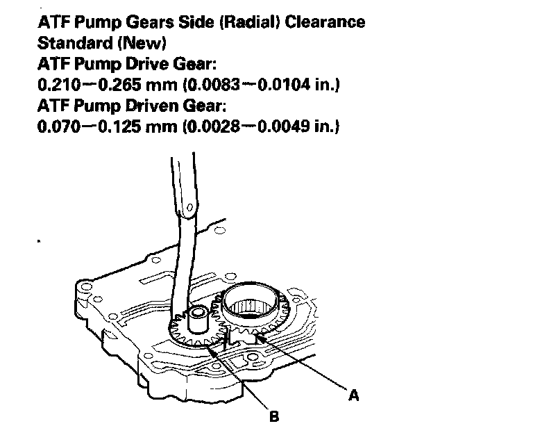 2. Measure the side clearance of the ATF pump drive gear (A) and driven gear (B).