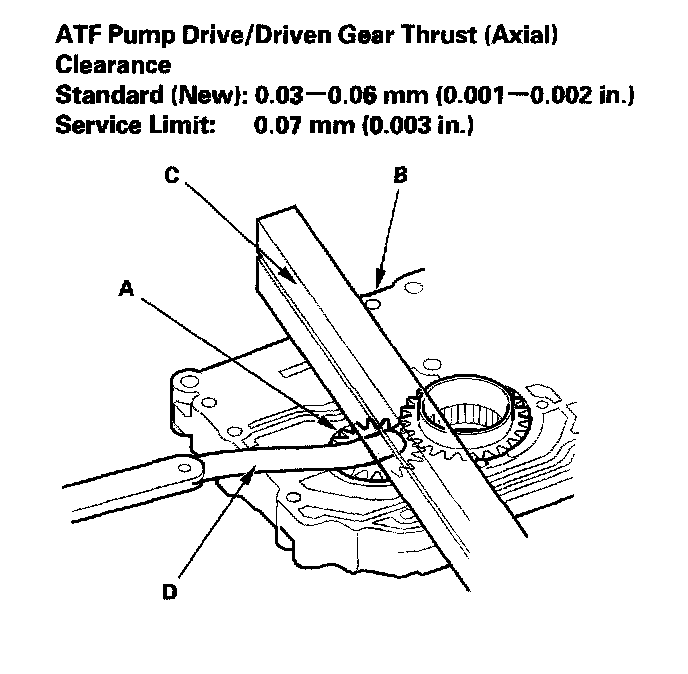 3. Remove the ATF pump driven gear shaft. Measure the thrust clearance between the ATF pump driven gear (A) and the valve body (B) with a straight edge (C) and a feeler gauge (D).