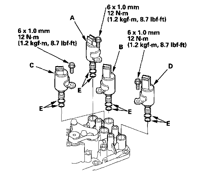 2. Install the new O-rings (E) on each solenoid valve.