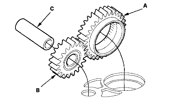 3. Install the ATF pump drive gear (A), ATF pump driven gear (B), and ATF pump driven gear shaft (C). Install the ATF pump driven gear with its grooved and chamfered side facing down.