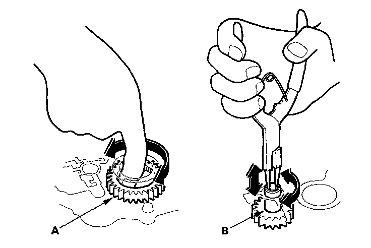 5. Make sure the ATF pump drive gear (A) rotates smoothly in the normal operating direction, and the ATF pump driven gear shaft (B) moves smoothly in the axial and normal operating direction.