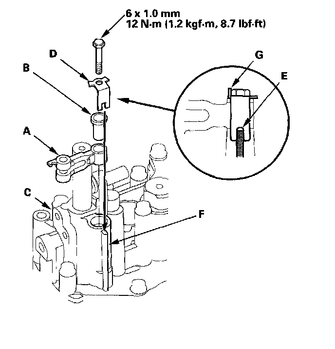 14. If the detent arm was removed, install the detent arm (A) with arm collar (B) on the servo body (C), and install the new lock washer (D) by aligning its cutout (E) with the projection (F) of the servo body. Install and tighten the bolt, then bend the lock tab (G) of the lock washer against the bolt head.